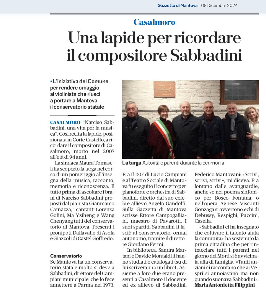 Dopo l’interesse suscitato dal concerto svoltosi lo scorso 29 maggio nell’ambito della rassegna I mercoledì del Conservatorio e grazie alla disponibilità dell’amministrazione comunale di Casalmoro (paese natale di Sabbadini), che nell’occasione, vorrebbe intitolare la sala di Corte Castello al Maestro, si vorrebbe riproporre il programma delle liriche scelte per voce e pianoforte di Narciso Sabbadini.